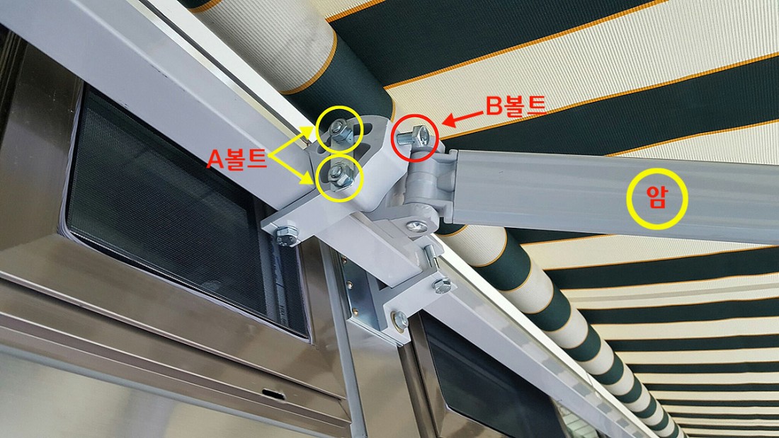 2) B볼트를 풀어주면 : 어닝 전체가 아래로 내려옵니다.